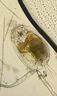 The anterodorsal margin features a notch that is semicircular in shape. In terms of dimensions, the dorsal plate typically ranges from 200 to 270 µm in length, while the ventral plate measures between 170 and 250 µm in length, with the toes spanning from 50 to 75 µm in length. Width-wise, the dorsal plate varies from 90 to 189 µm, while the ventral plate ranges from 80 to 105 µm. This species is most commonly found in eutrophic environments and has been observed attached to colonies of Chlorella and Chlamydomonas reinhardtii. Its diet includes bacteria, green algae, and diatoms.