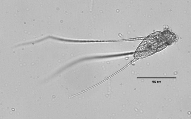 The organism’s body appeared somewhat contracted, measuring around 90 µm in length. A clearly visible posterior seta was observed, situated on the ventral side of the body and extending to a length around 40 µm. Furthermore, there are two anterior setae with a significant length about 110 µm each. It is probable that these anterior setae were approximately equal in length to the body when the organism was alive.