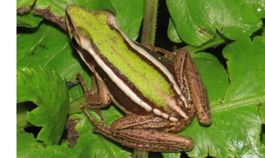 The head is elongated with a pointed snout. The dorsal surface is light brown or greenish, while the sides are dark brown. A glandular dorsolateral fold is whitish with a yellow to golden hue and edged with black. Sometimes, an indistinct fold extends from behind the tympanum to the shoulder. The ventral surface is white. The fingers are free, and the toes are almost fully webbed.