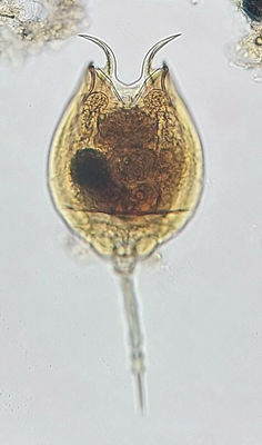 The lorica of this organism is broadly ovate, measuring between 200 and 270 µm in length, including the foot and toes. At the anterior end of the lorica, there are two long and curved spines accompanied by two short spines on each side. The ventral margin exhibits a V-shaped sinus. Typically, it is brownish or yellow-brown in color, with a rounded posterior margin. The foot consists of two segments, but only one extends beyond the lorica. A single fused toe is present, which is slender and parallel-sided, showing faint annular constrictions. The pointed claws feature basal spines.